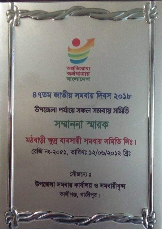 ৪৭ তম জাতীয় সমবায় দিবসে মঠবাড়ী ক্ষুদ্র ব্যবসায়ী সমবায় সমিতি লিঃ কে কালীগঞ্জ থানা সমবায় কার্যালয় থানা পর্যায়ে সফল সমবায় সমিতি হিসেবে এবং জেলা সমবায় সমবায় কার্যালয় জেলা পর্যায়ে শ্রেষ্ঠ সমবায় সমিতি হিসেবে সম্মাননা স্মারক প্রদান করেন।